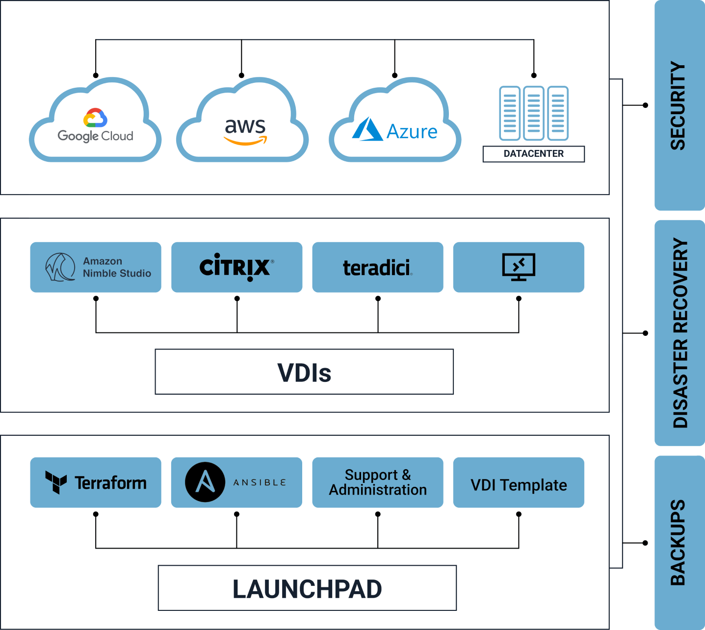 An automated deployment solution built using Terraform and Ansible to deploy VDI to any Cloud using your choice of technology. This could mean many options such as Citrix, Teradici, Remote Desktop Services, Azure Virtual Desktop, and AWS Nimble Studio. We are not only cloud agnostic; we are tools agnostic as well. We provide value rather than tools or technology, or cloud services to our customers.